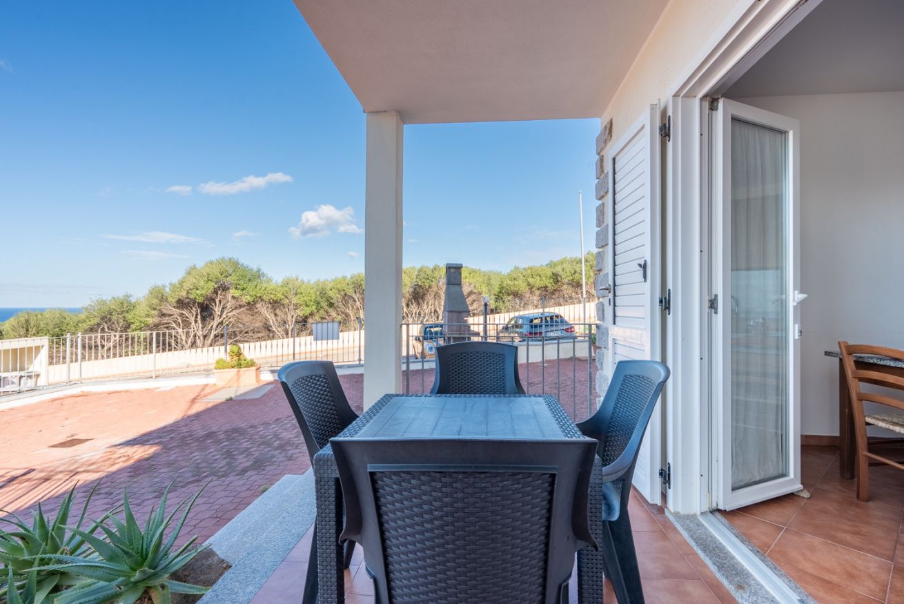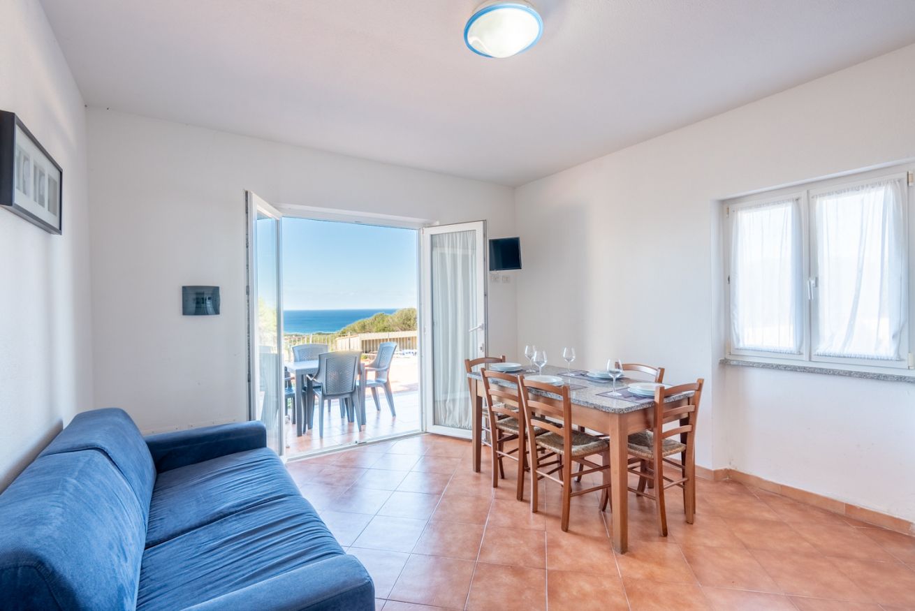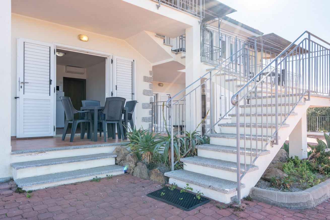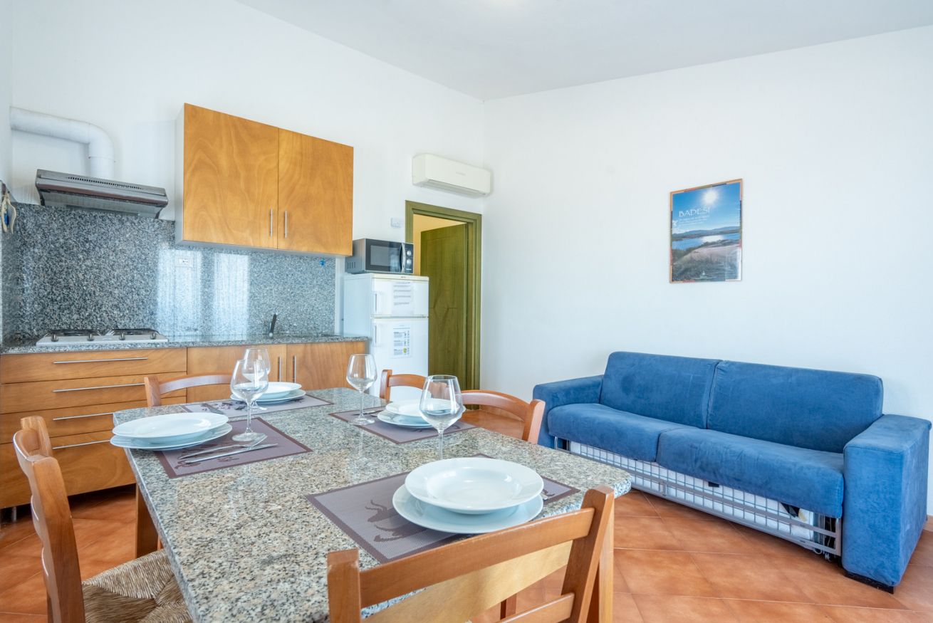Appartamento al piano terreno con una camera da letto matrimoniale/ doppio singolo, un bagno con doccia, soggiorno con cucina con 1 divano letto doppio, balcone arredato con vista mare. Climatizzatore caldo/freddo, WI-FI.